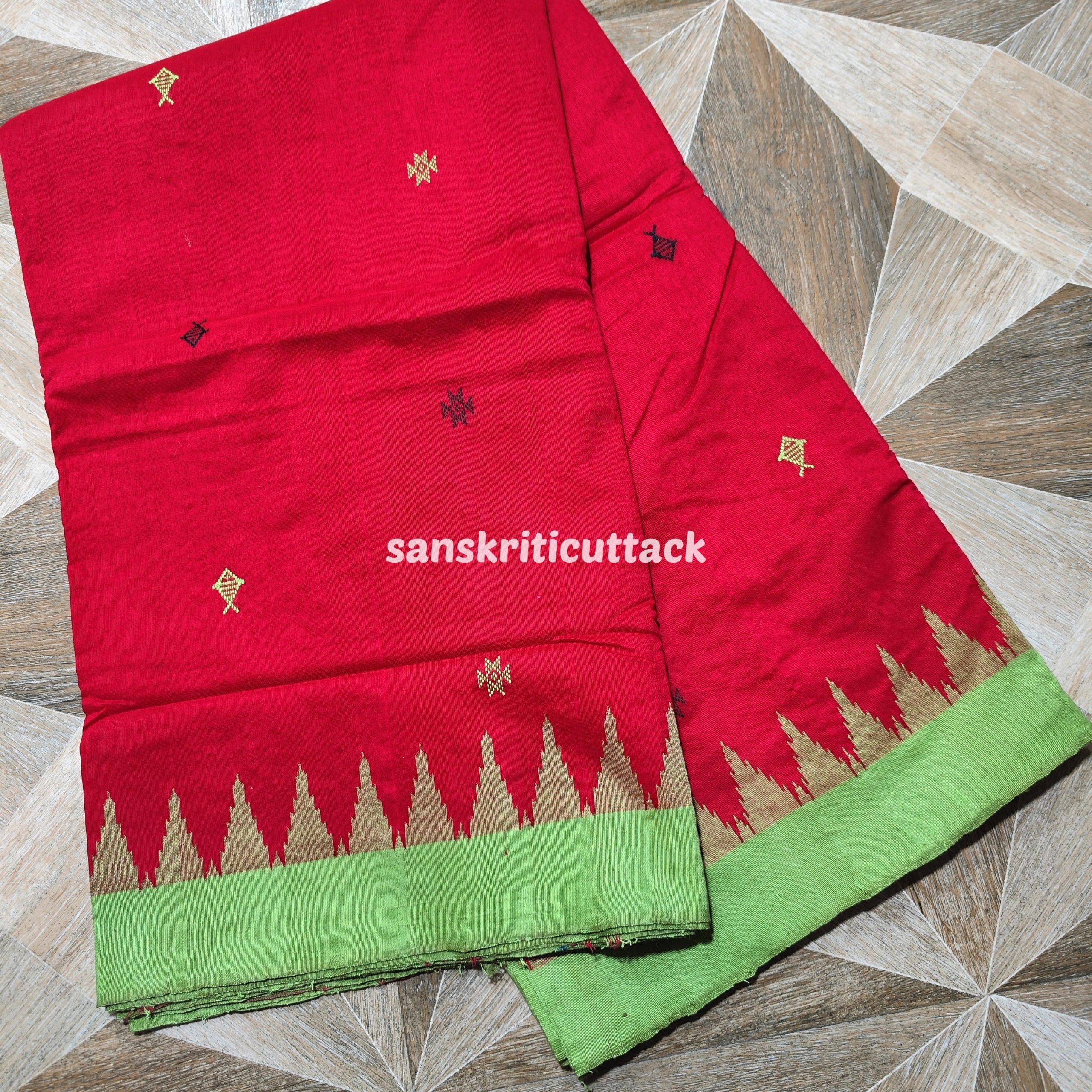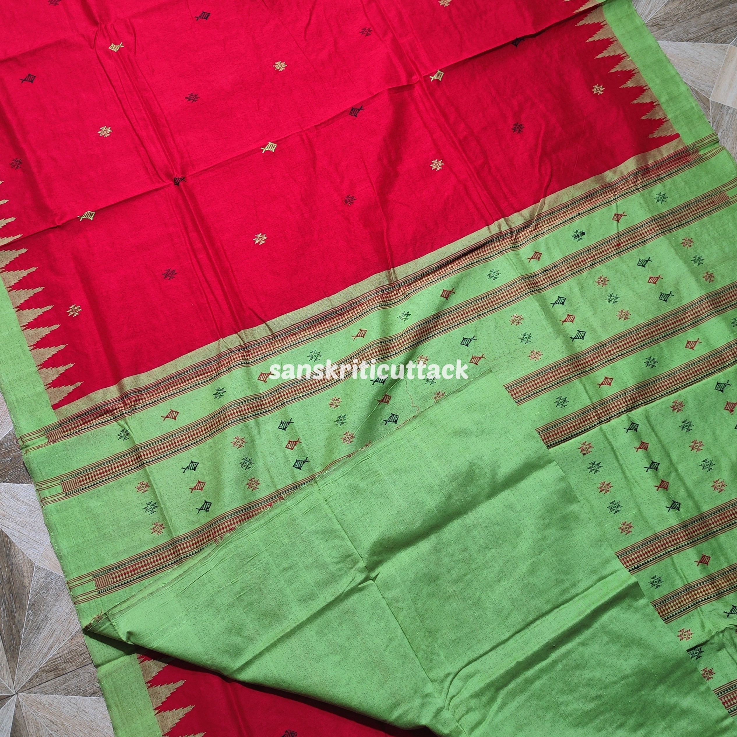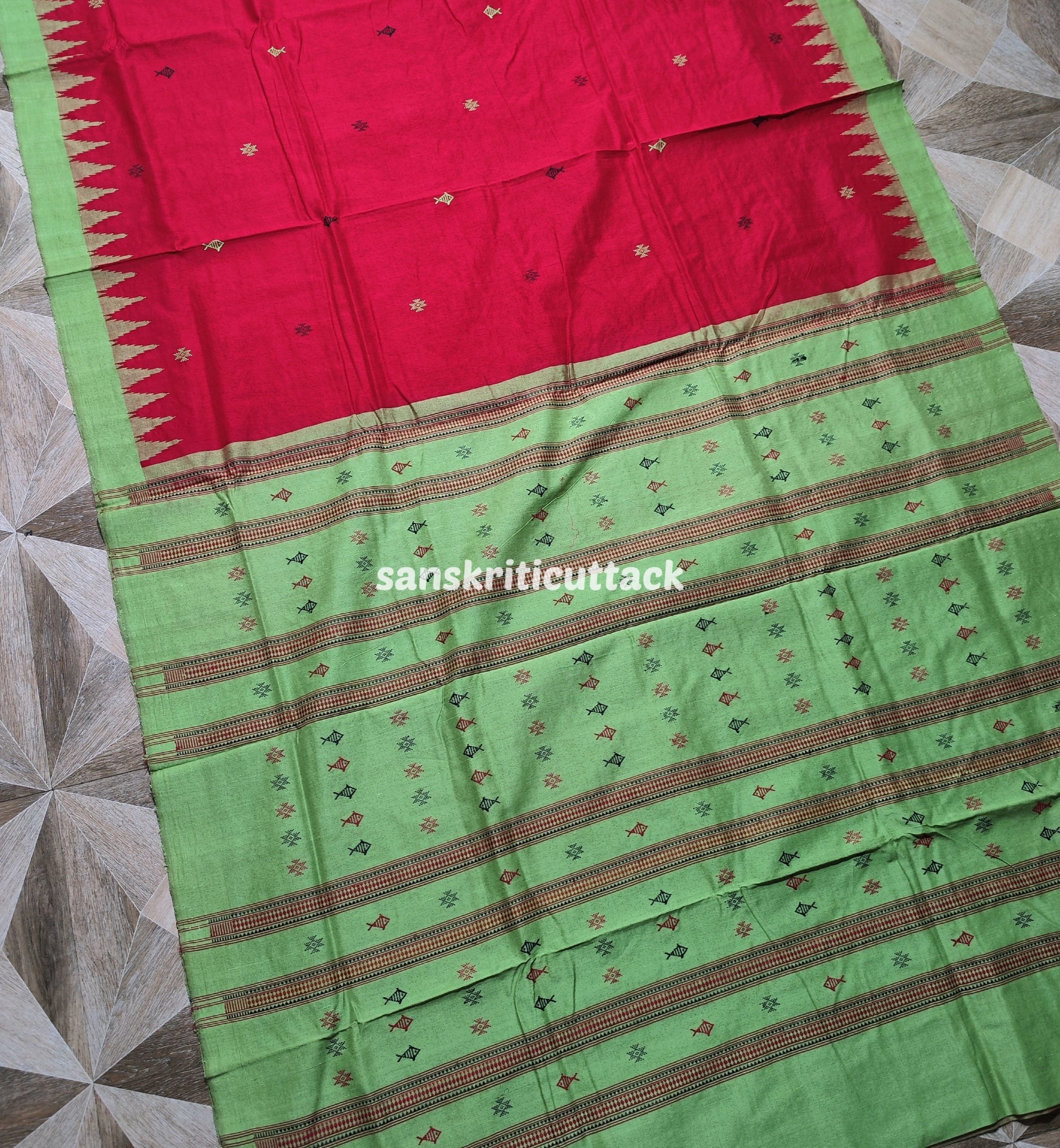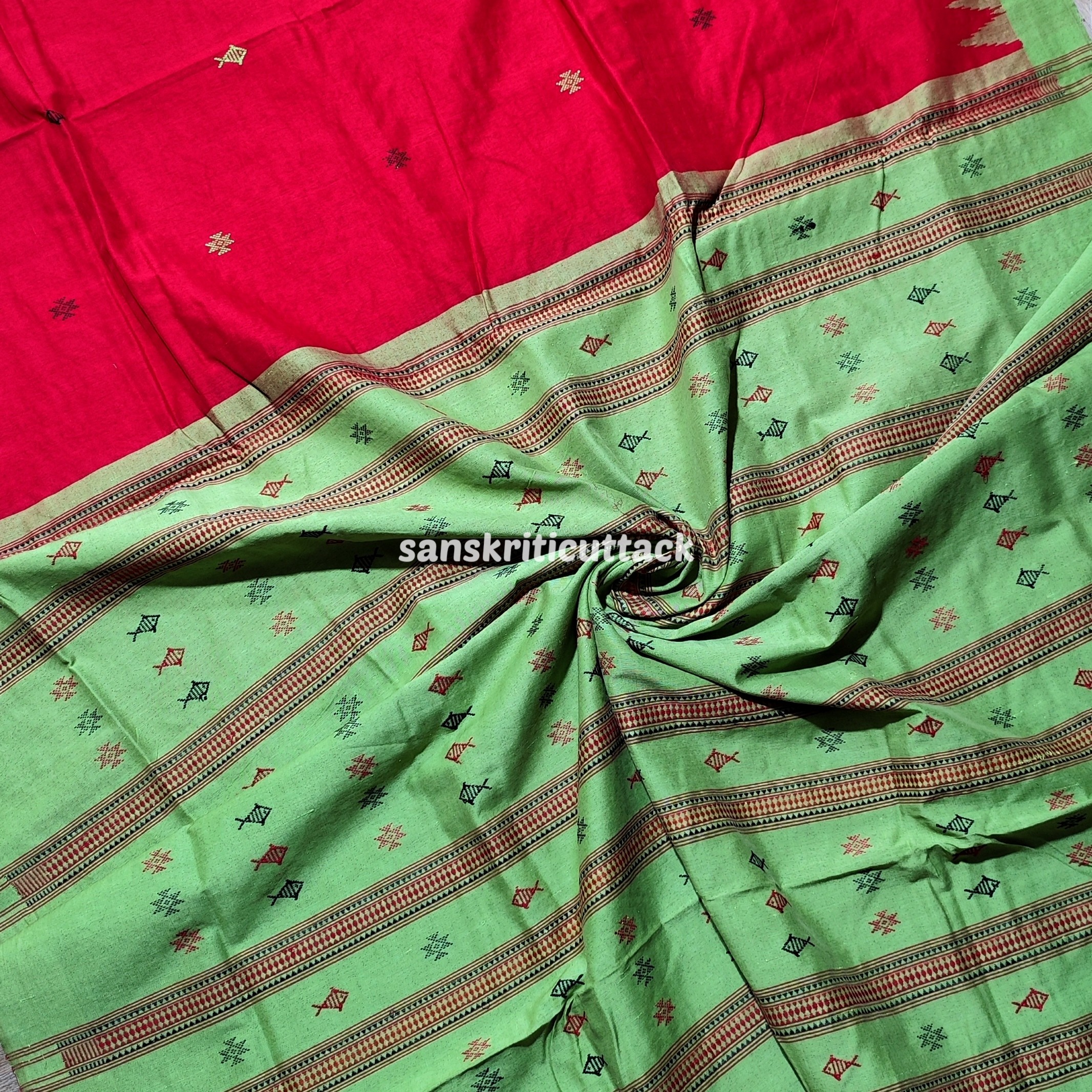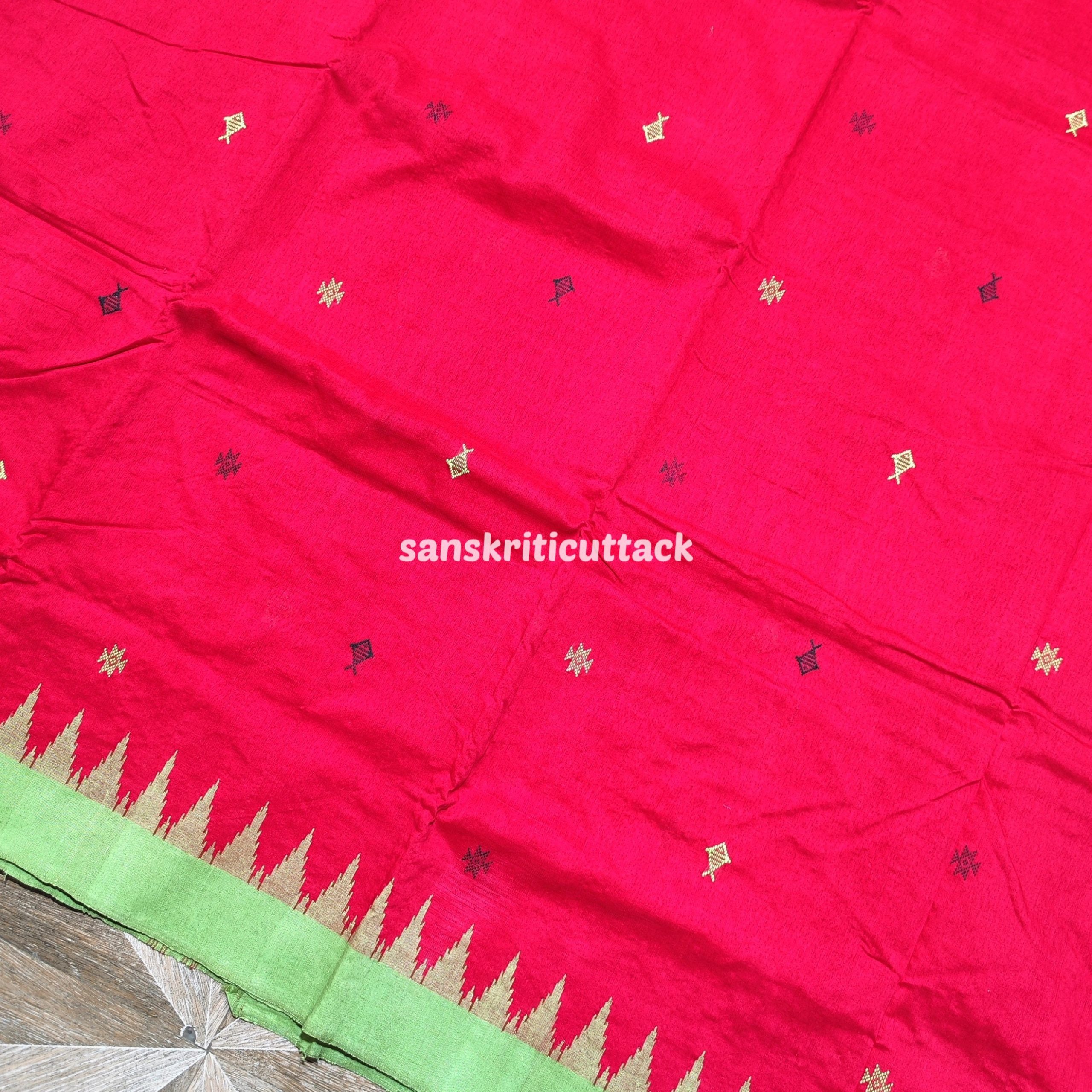Experience the artistic legacy of Odisha handloom with this Red & Light Green Kotpad Cotton Saree — an exquisite saree crafted on traditional looms by skilled tribal weavers. The rich red body is beautifully adorned with classic fish and star motifs woven throughout the fabric, adding cultural depth and visual charm. A bright light green phoda kumbha border and matching pallu with extra weft motifs create a delightful, vibrant contrast that catches the eye.