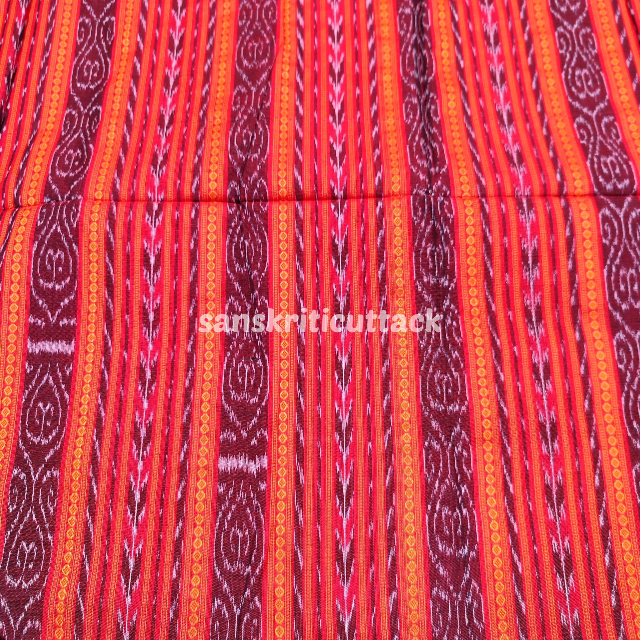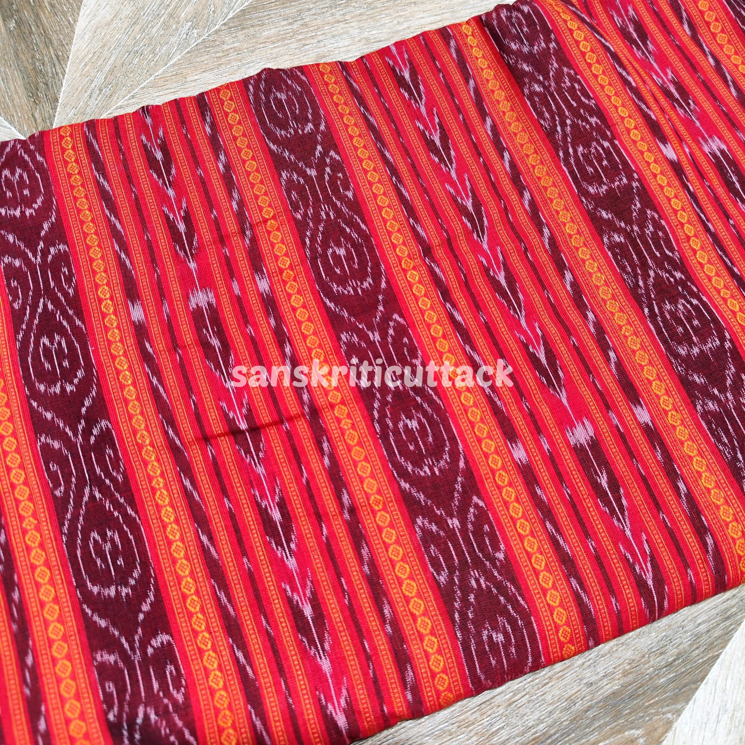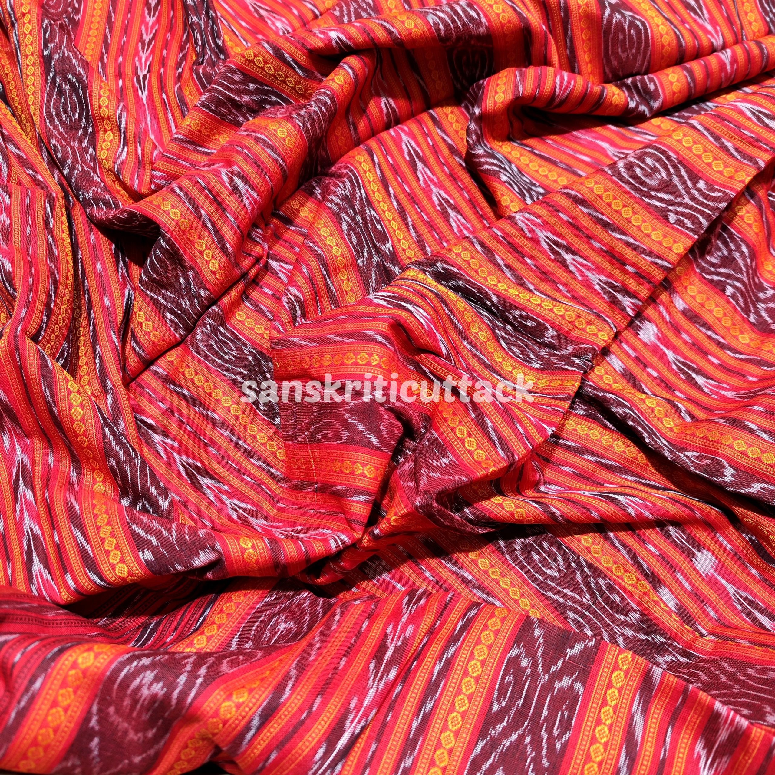 Elevate your fashion game with this stunning Red Orange Handloom Cotton Sambalpuri Ikat Fabric. Handwoven by skilled artisans using natural dyes, this Ikat fabric features a beautiful traditional Ikat pattern in vibrant shades of red and orange. Made of soft Ikat cotton, this eco-friendly and sustainable fabric is perfect for creating one-of-a-kind Ikat clothing pieces. With its unique Ikat design and artisanal weave, this fabric is a true representation of the rich cultural heritage of India. Add this colorful Ikat fabric to your collection today and make a statement with your fashion choices!
