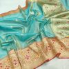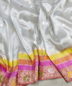 Elevate your style with our Silver Tissue Kadwa Banarasi Silk Saree, a masterpiece of craftsmanship. Handwoven with intricate silver and gold zari booties that shimmer gracefully, the saree features captivating multicolour horizontal stripes adding a contemporary touch. The contrast golden zari with meenakari floral border and pallu exudes timeless elegance.