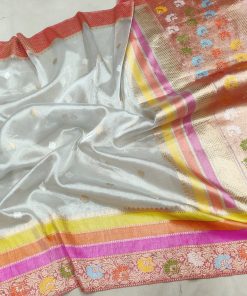 Elevate your style with our Silver Tissue Kadwa Banarasi Silk Saree, a masterpiece of craftsmanship. Handwoven with intricate silver and gold zari booties that shimmer gracefully, the saree features captivating multicolour horizontal stripes adding a contemporary touch. The contrast golden zari with meenakari floral border and pallu exudes timeless elegance.