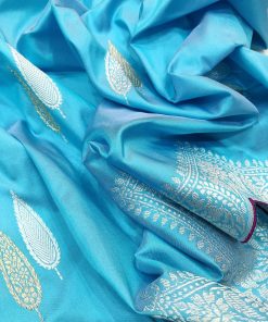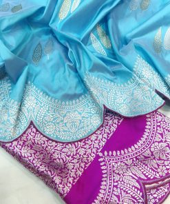 Indulge in the regal elegance of our Sky Blue Pure Katan Silk Kadwa Banarasi Saree. Crafted with care, this exquisite saree features mesmerizing silver and gold zari booties that add a touch of sparkle to its rich texture. The designer silver zari scallop border and pallu create a majestic statement, ensuring you stand out at any occasion. The contrast purple blouse piece, exquisitely piped like the saree, completes the ensemble perfectly. Embrace timeless charm and sophistication with this stunning Banarasi saree.