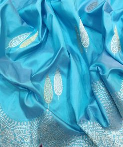 Silk saree, Banarasi saree, Sky blue saree, Designer zari saree, Silver and gold booties saree, Pure katan silk, Scalloped border, Contrast blouse piece, Elegant saree. buy Banarasi saree, Pure silk saree, Designer zari work, Silver zari booties, Kadwa saree, Sky blue silk saree, High volume saree, Low competition silk saree, Silk saree online, Silk saree with pallu, Regal silk saree, Silk saree for occasions, Designer blouse piece.