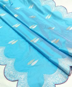 Indulge in the regal elegance of our Sky Blue Pure Katan Silk Kadwa Banarasi Saree. Crafted with care, this exquisite saree features mesmerizing silver and gold zari booties that add a touch of sparkle to its rich texture. The designer silver zari scallop border and pallu create a majestic statement, ensuring you stand out at any occasion. The contrast purple blouse piece, exquisitely piped like the saree, completes the ensemble perfectly. Embrace timeless charm and sophistication with this stunning Banarasi saree.
