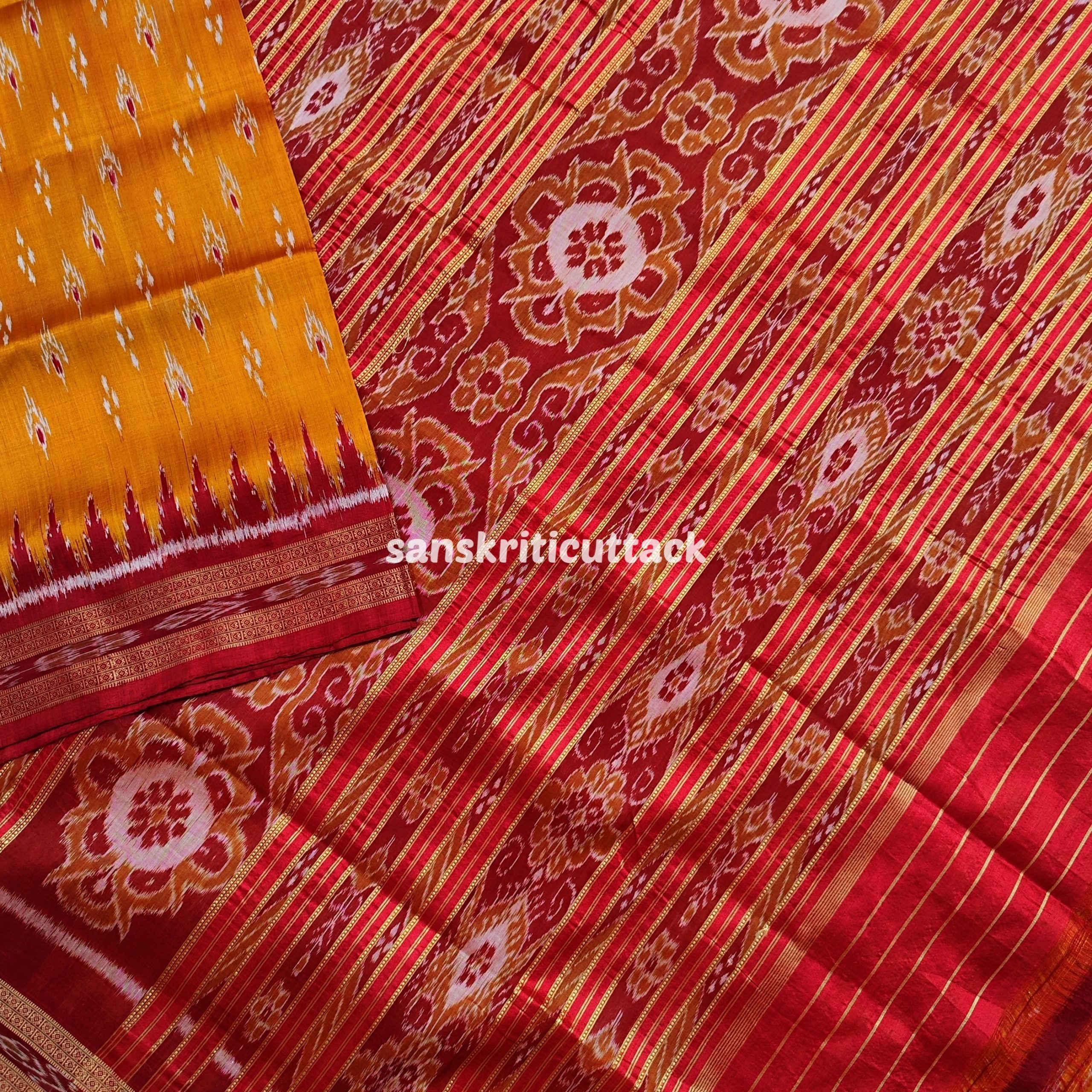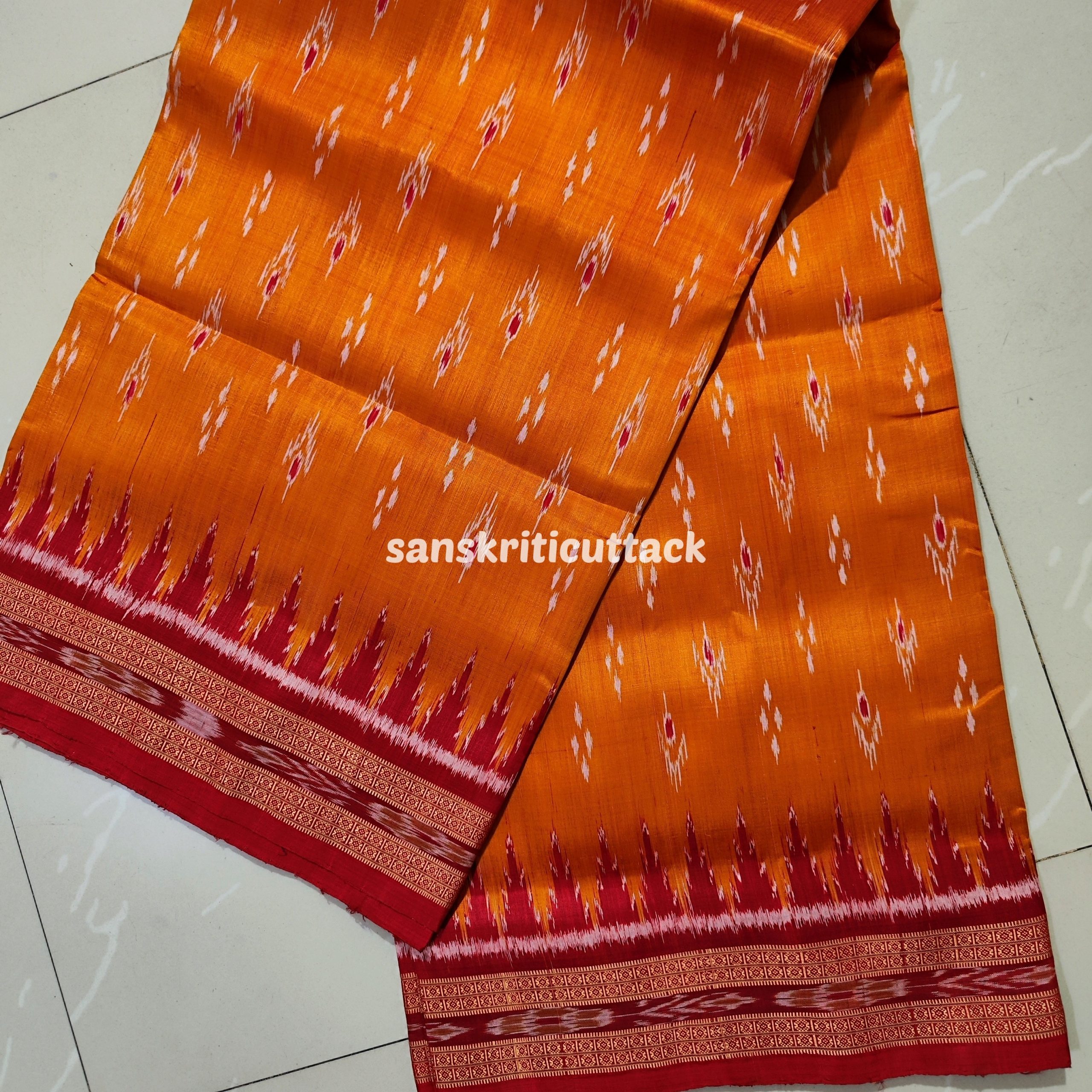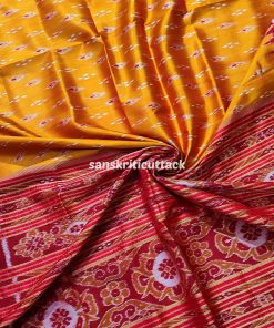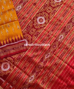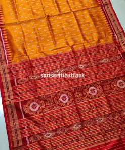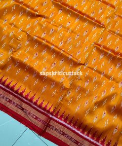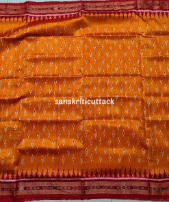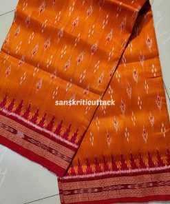 Immerse yourself in the timeless allure of our Sunset Orange Maroon Mayur Chandrika Khandua Silk Saree. The meticulously handcrafted body features an enchanting mayur chandrika ikat design, lending a touch of artistic sophistication. The border and pallu, adorned with Maroon Ikat motifs and Kumbha designs, add a regal charm to this masterpiece. Hailing from the rich weaving traditions of Odisha, Khandua sarees showcase the epitome of handloom craftsmanship. The ikat tie-dyed silk accentuates the saree’s allure, while the intricate temple borders offer a mesmerizing visual narrative. Please note that our Khandua sarees do not include blouses, allowing you the freedom to pair them with your preferred style. Indulge in the cultural legacy of Odisha with this exquisite ensemble. Elevate your wardrobe with the perfect blend of tradition and contemporary elegance that our Sunset Orange Maroon Mayur Chandrika Khandua Silk Saree embodies.