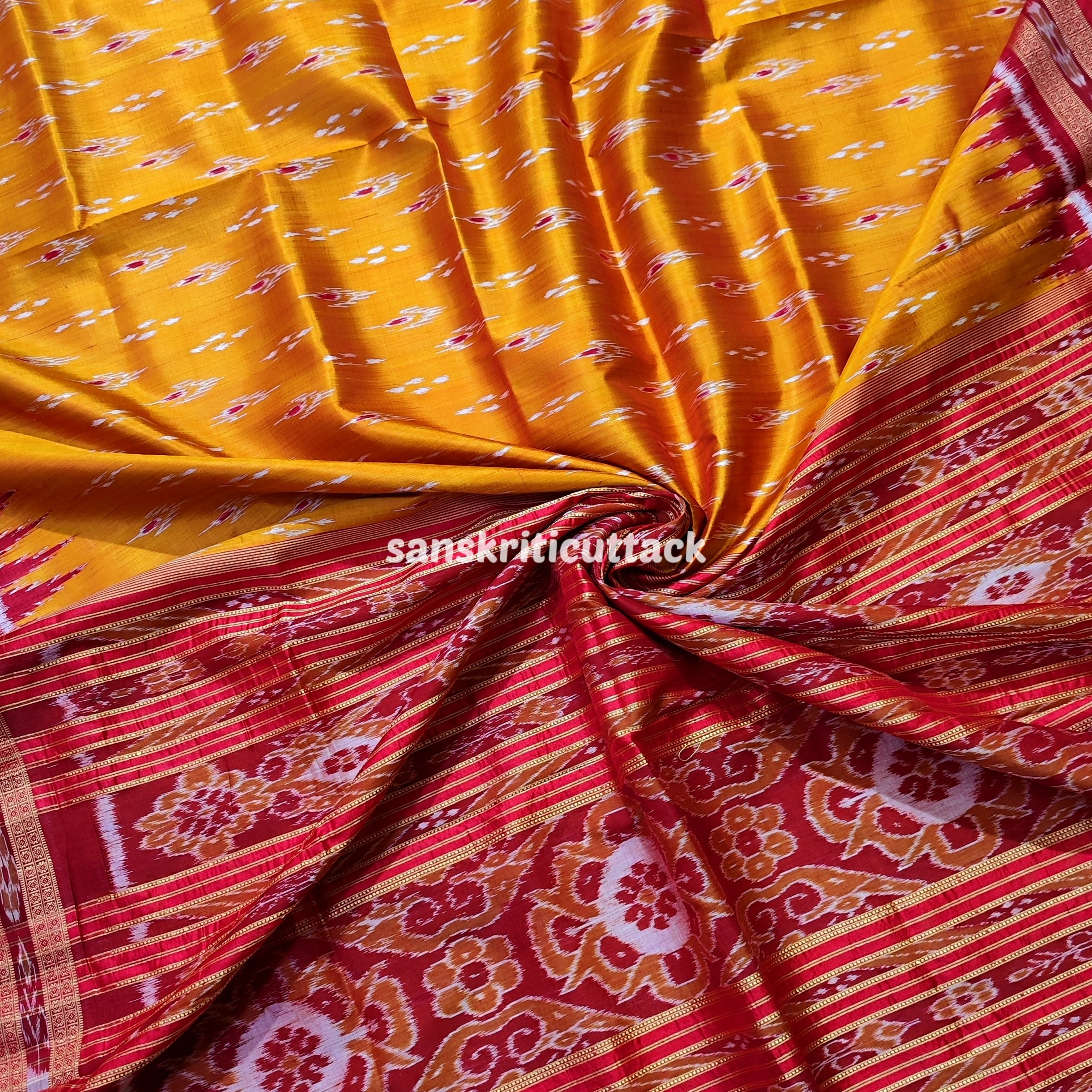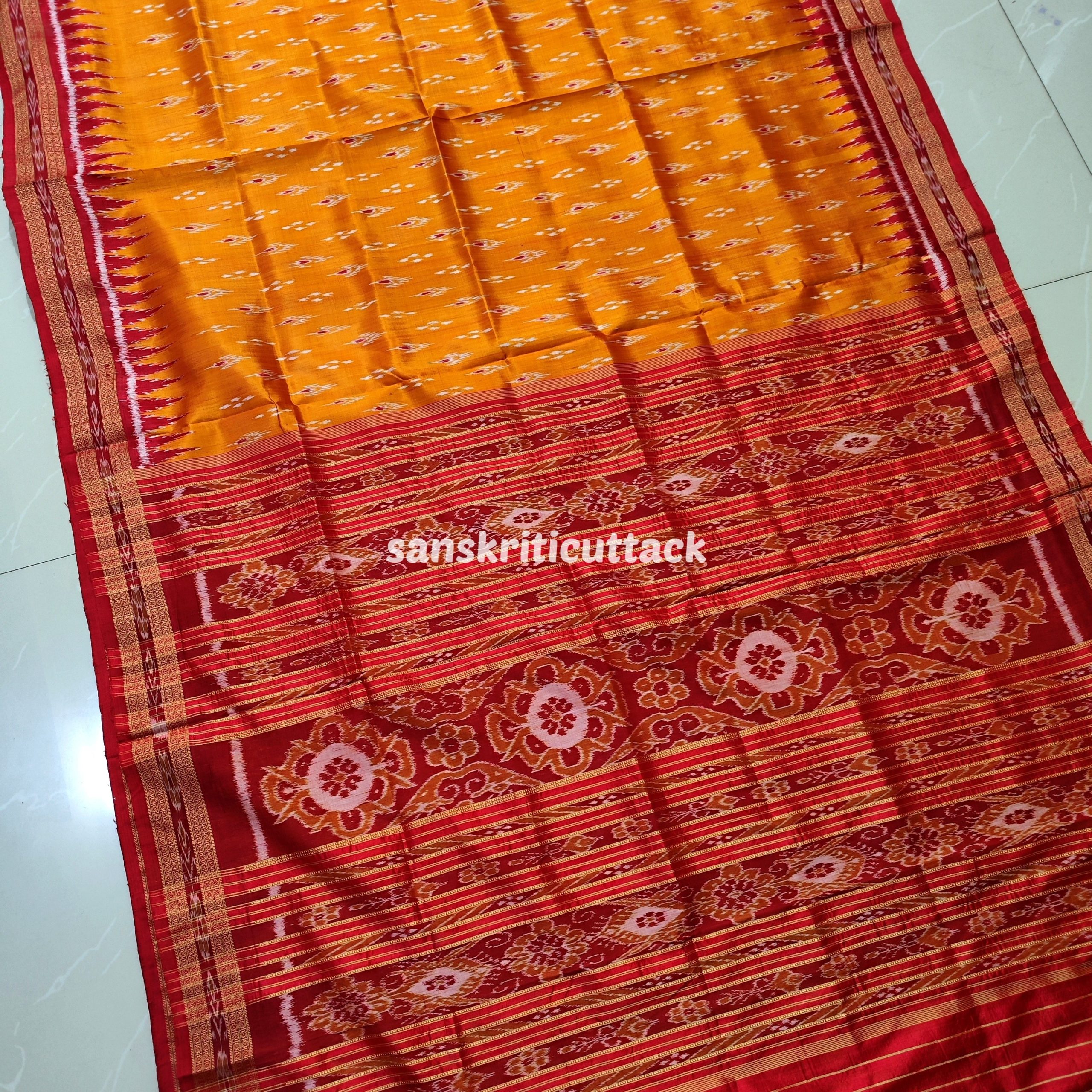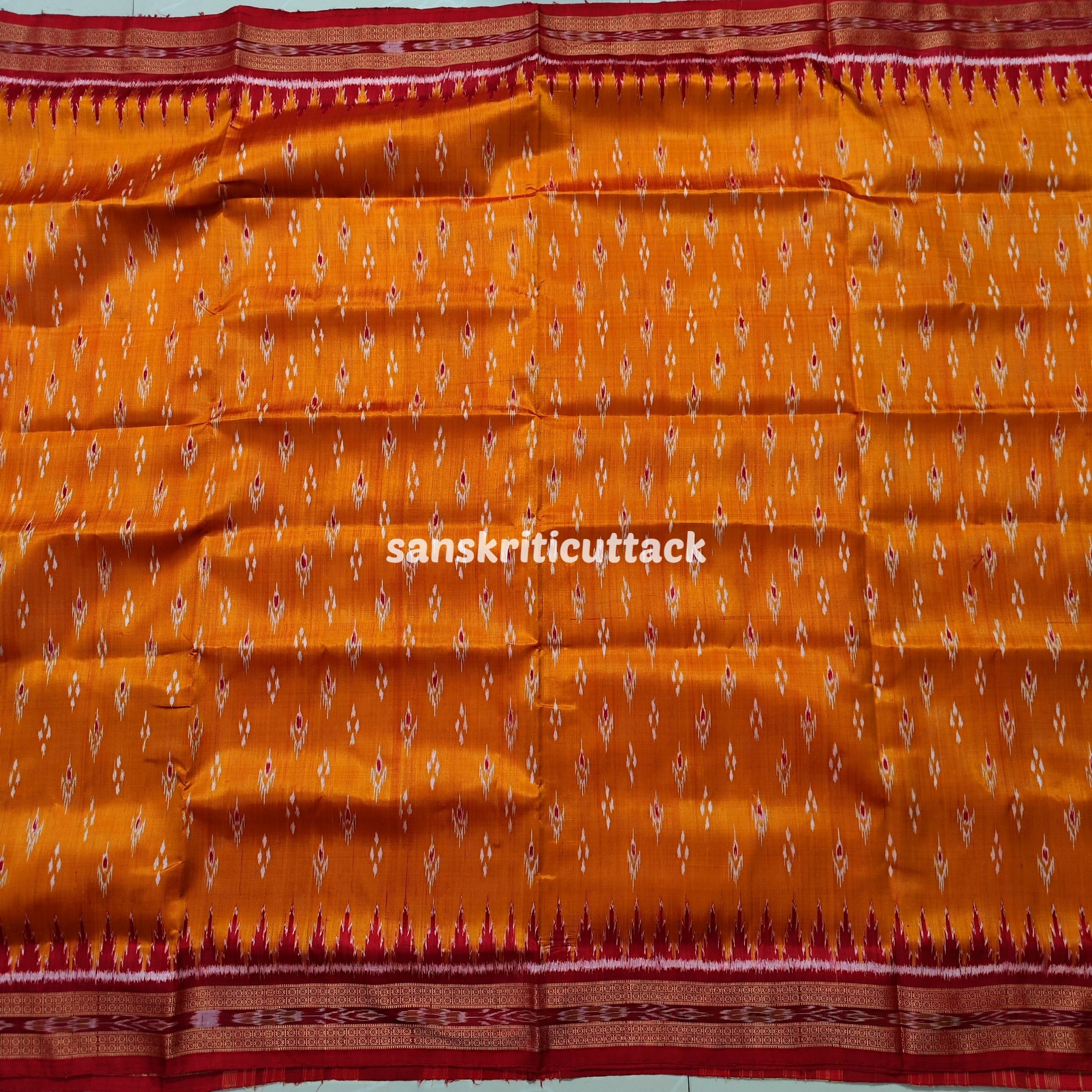 Immerse yourself in the timeless allure of our Sunset Orange Maroon Mayur Chandrika Khandua Silk Saree. The meticulously handcrafted body features an enchanting mayur chandrika ikat design, lending a touch of artistic sophistication. The border and pallu, adorned with Maroon Ikat motifs and Kumbha designs, add a regal charm to this masterpiece. Hailing from the rich weaving traditions of Odisha, Khandua sarees showcase the epitome of handloom craftsmanship. The ikat tie-dyed silk accentuates the saree’s allure, while the intricate temple borders offer a mesmerizing visual narrative. Please note that our Khandua sarees do not include blouses, allowing you the freedom to pair them with your preferred style. Indulge in the cultural legacy of Odisha with this exquisite ensemble. Elevate your wardrobe with the perfect blend of tradition and contemporary elegance that our Sunset Orange Maroon Mayur Chandrika Khandua Silk Saree embodies.