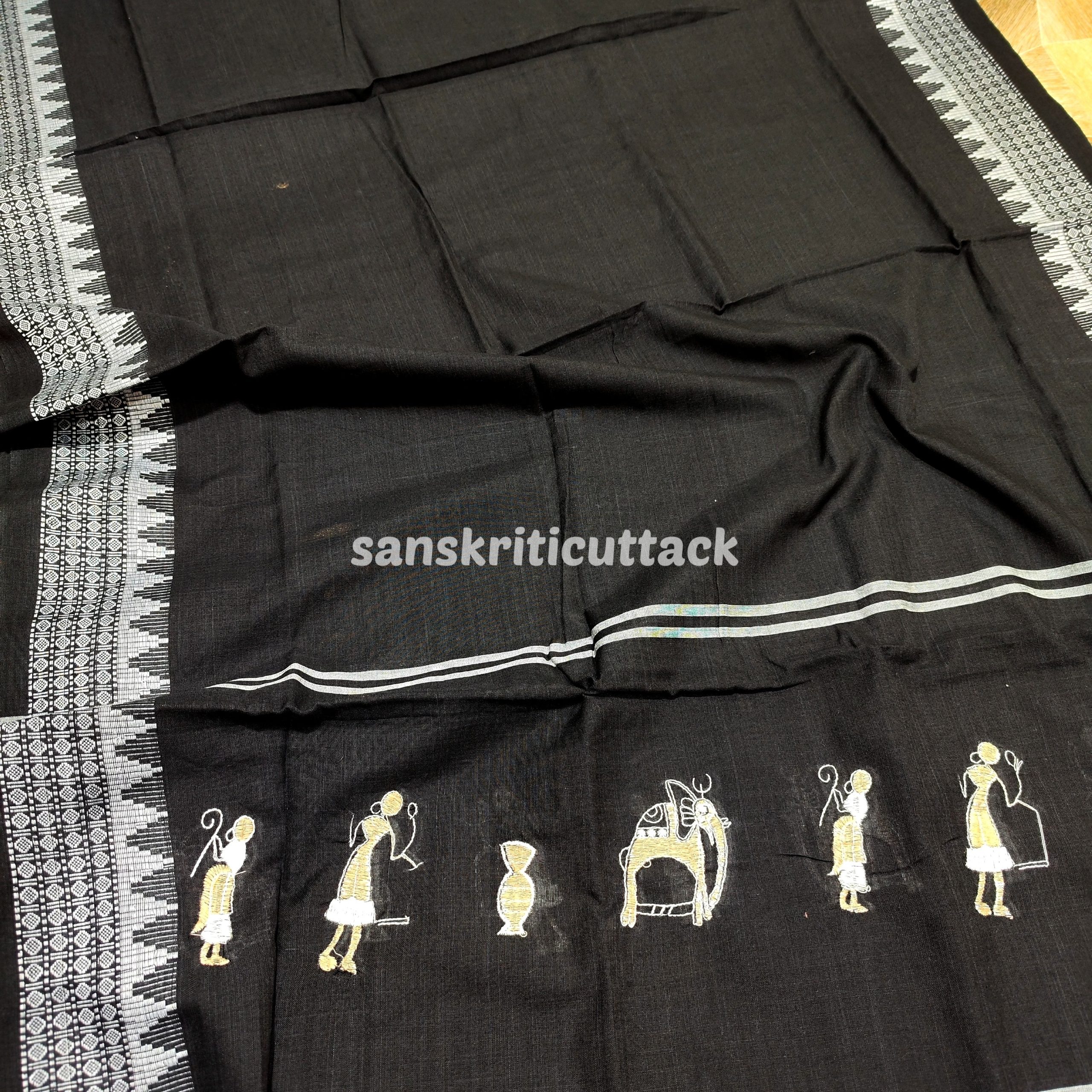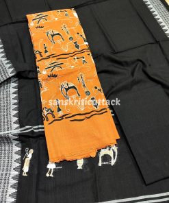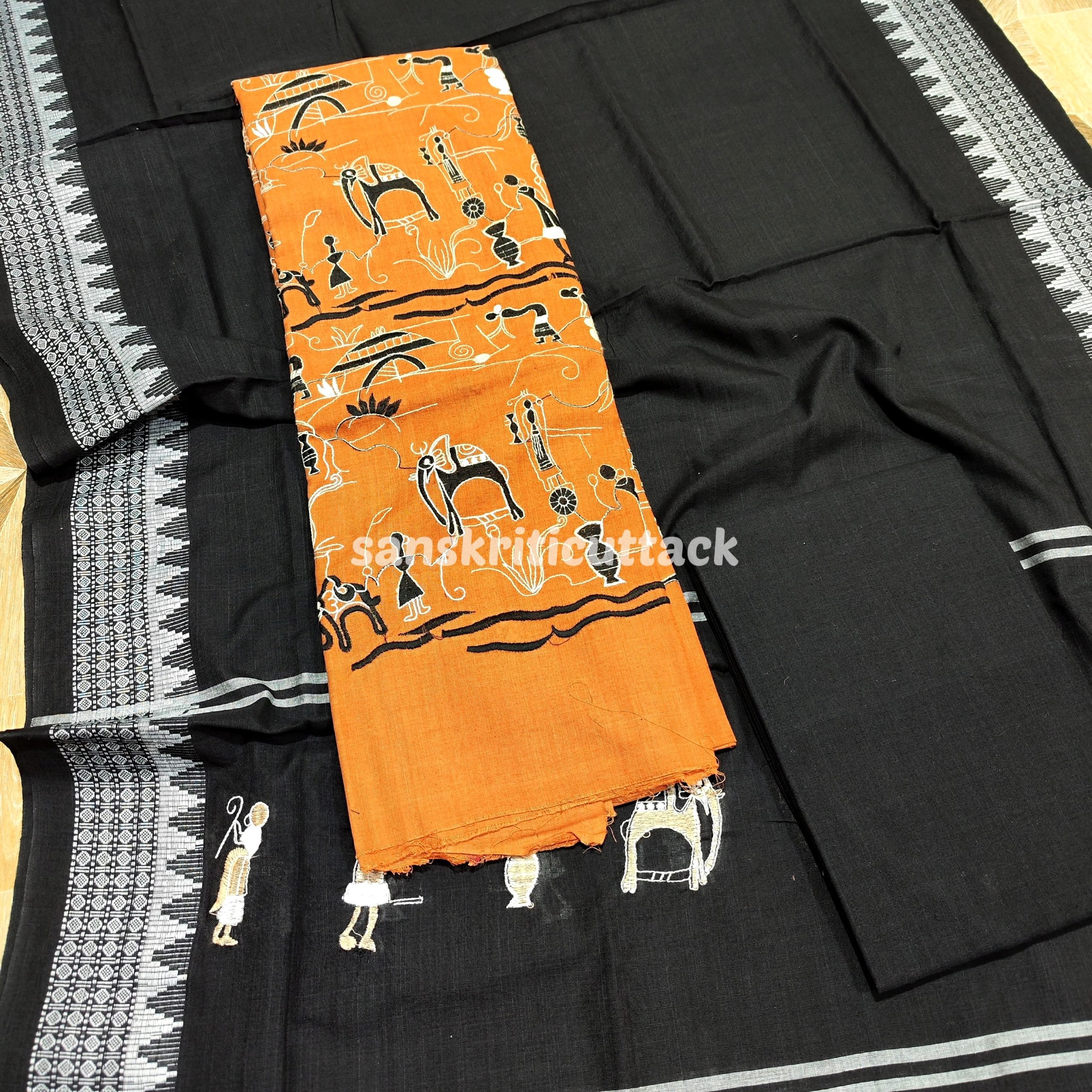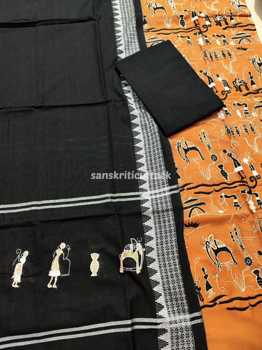 Elevate your style quotient with our Tan Black Nuapatna Embroidery Handloom Cotton Dress Material. Designed to perfection, this exquisite dress material combines the allure of traditional Indian craftsmanship with modern trends.