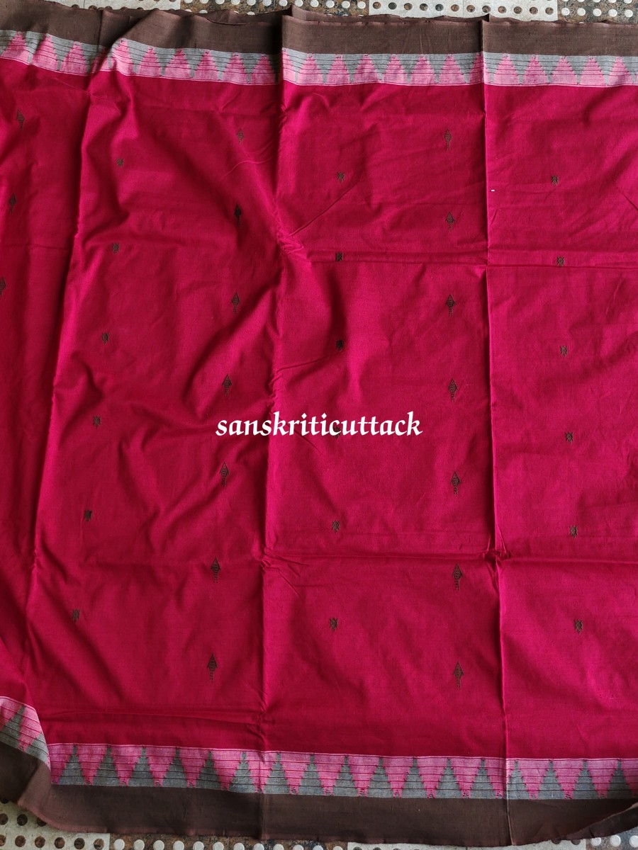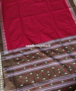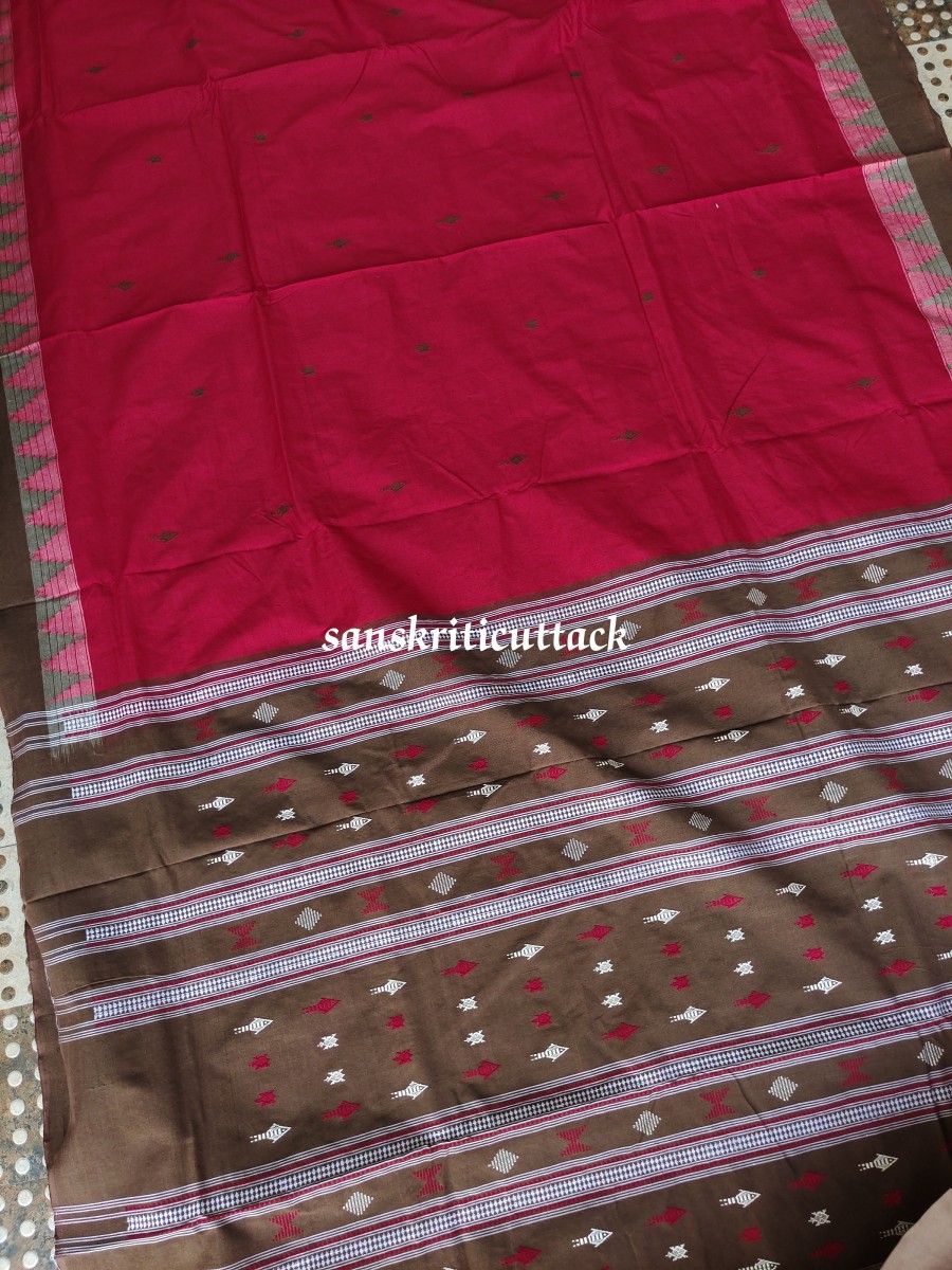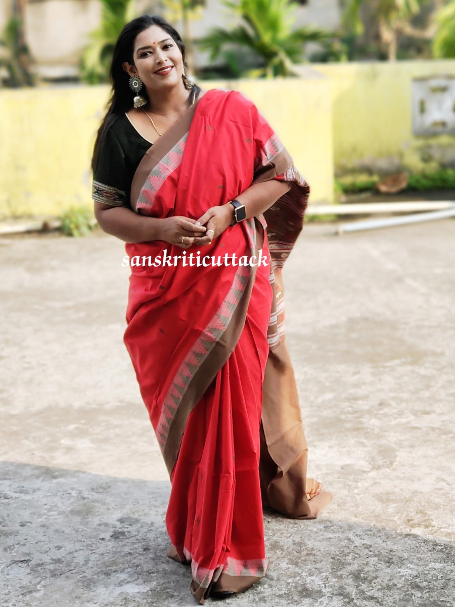 Experience a beautiful fusion of tradition and contemporary elegance with our Tomato Red & Soil Brown Handwoven Cotton Kotpad Saree — an authentic handloom masterpiece from Odisha. Made from premium organic cotton, this saree showcases a rich tomato‑red body complemented by soil brown accents, giving it a warm, earthy aesthetic that’s both eye‑catching and versatile.