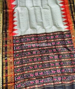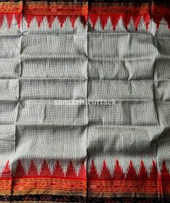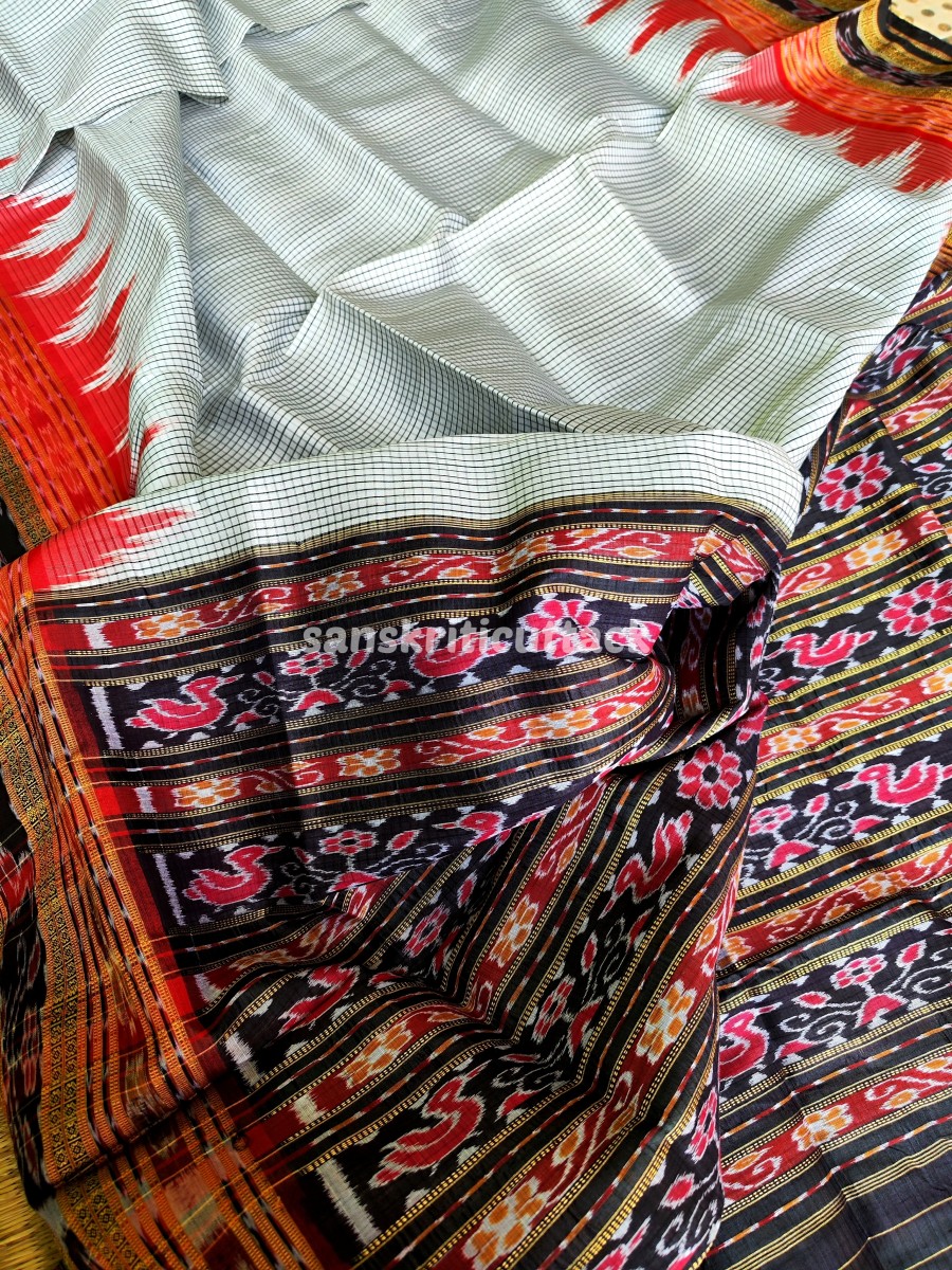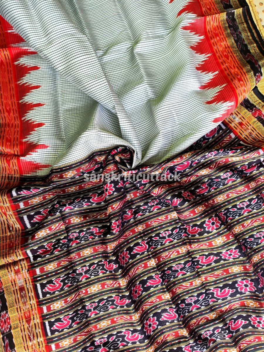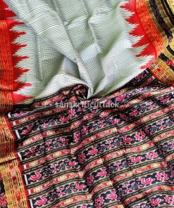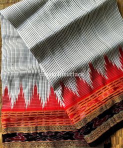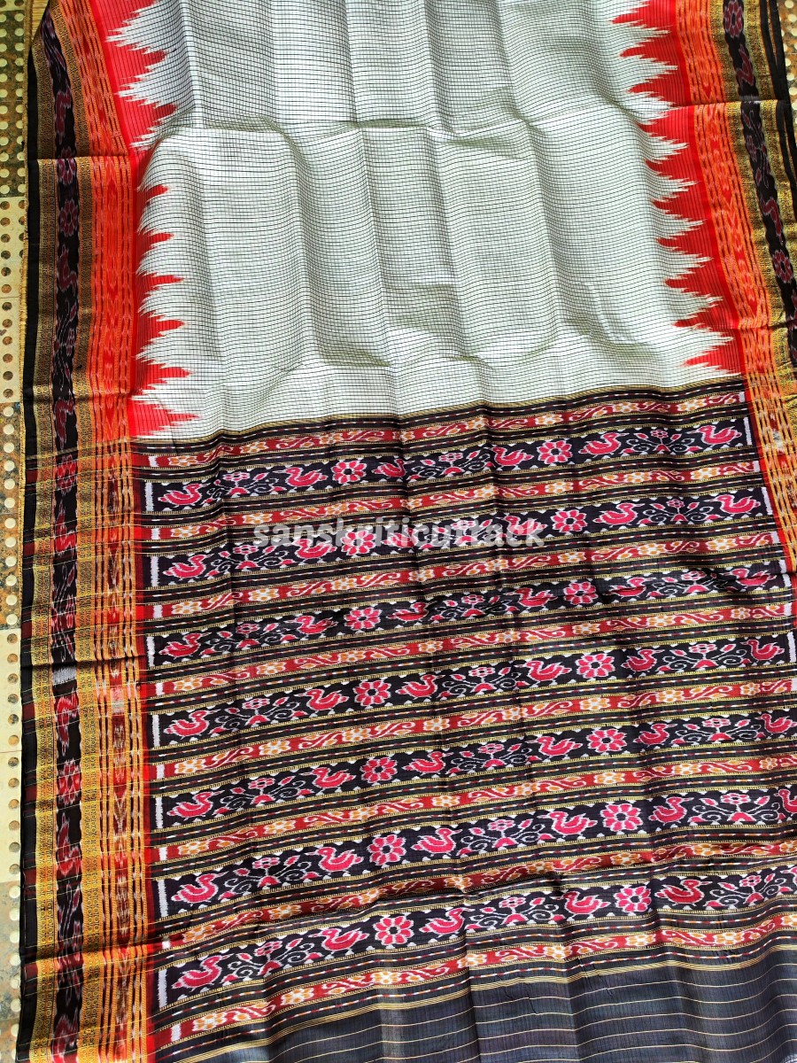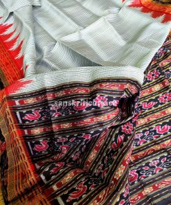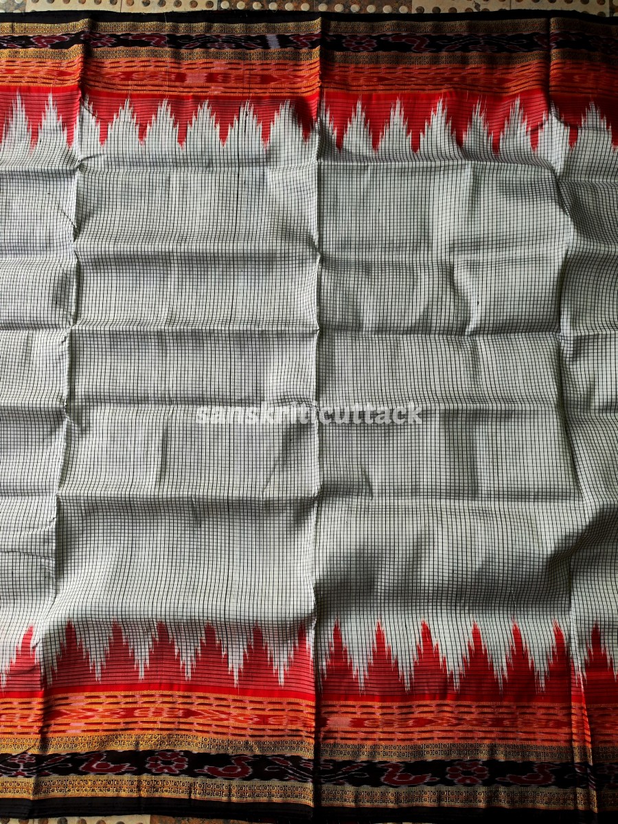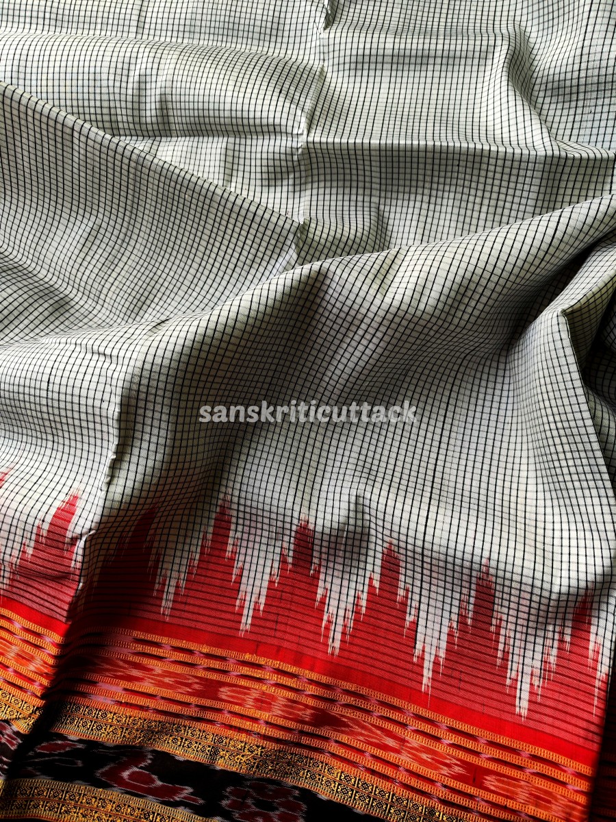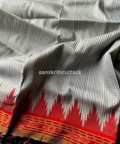 Discover elegance with our Handloom Ikat Sachipar Khandua Pata Saree in white, black, and red. Handcrafted by skilled artisans, this traditional masterpiece showcases intricate Checks Ikat patterns that reflect a rich cultural heritage. Crafted from premium handloom silk, it offers a luxurious drape while ensuring comfort. The striking color combination adds a touch of sophistication, making it perfect for special occasions. Elevate your fashion quotient with this exquisite saree that embodies timeless beauty and craftsmanship.