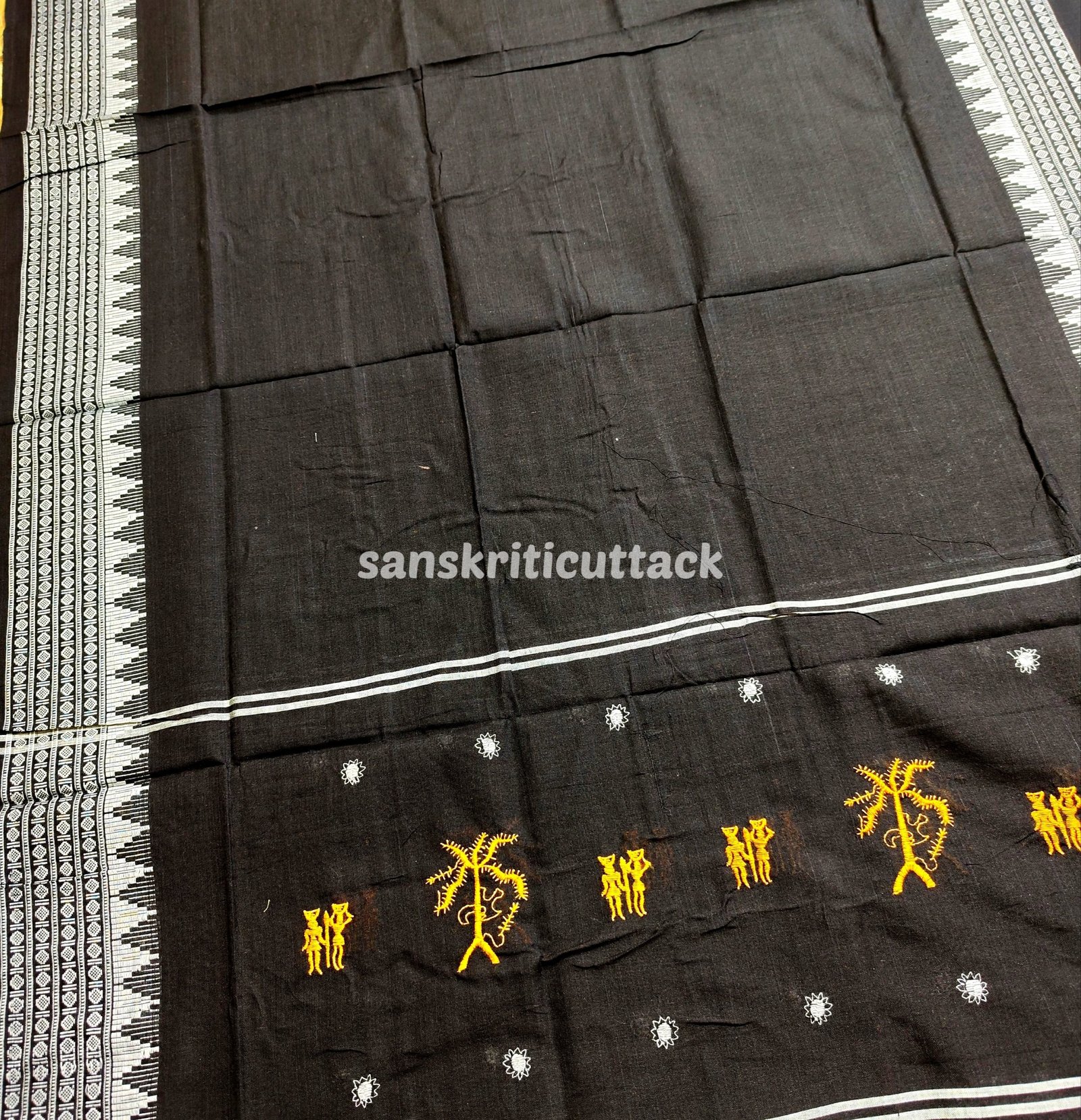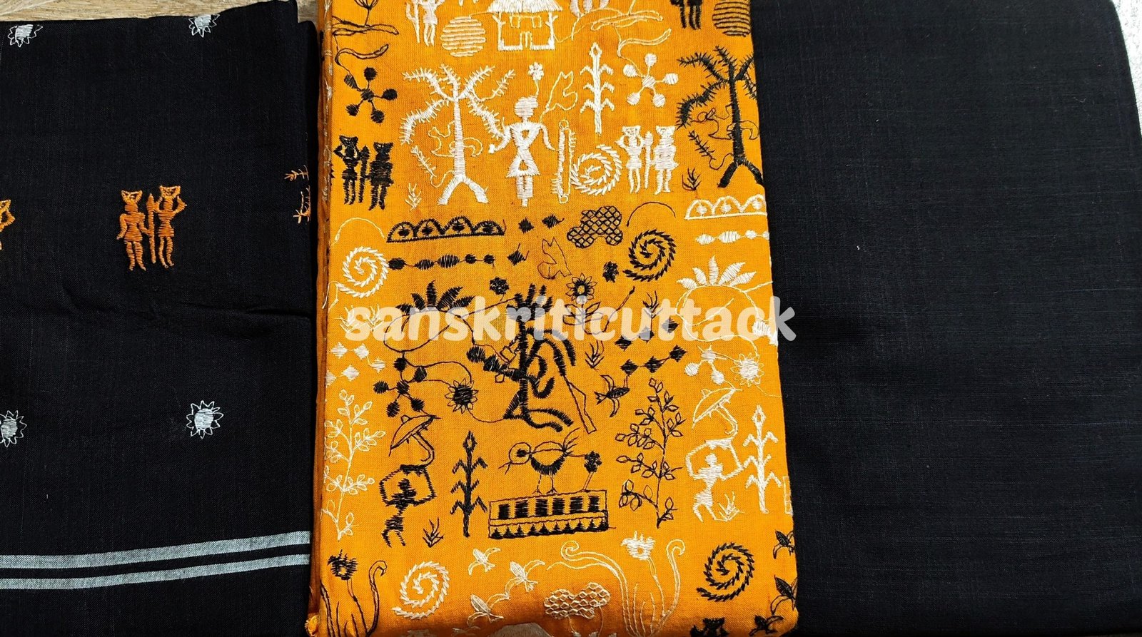 Yellow Black Embroidery Nuapatna Handloom Cotton Dress Material
