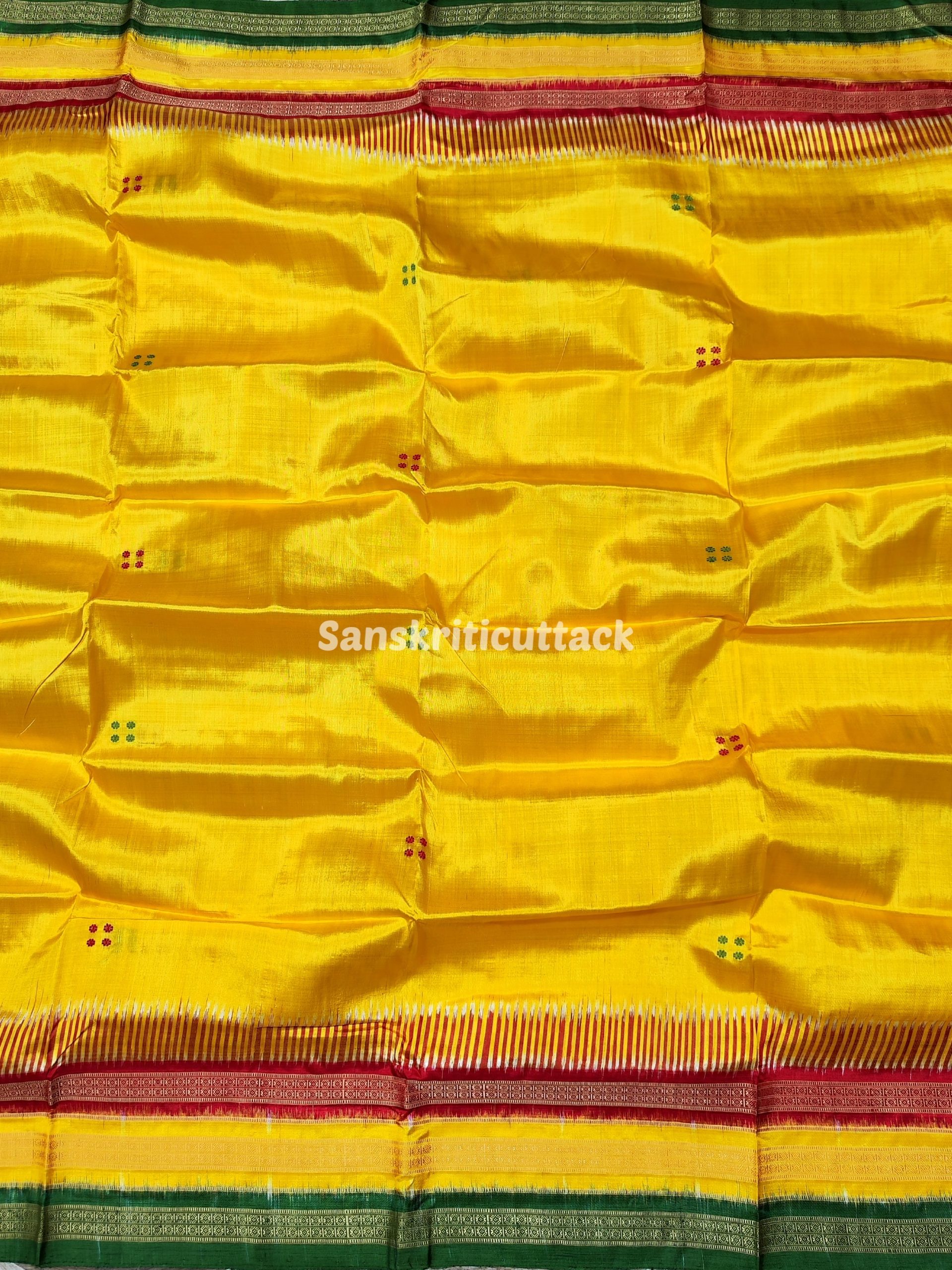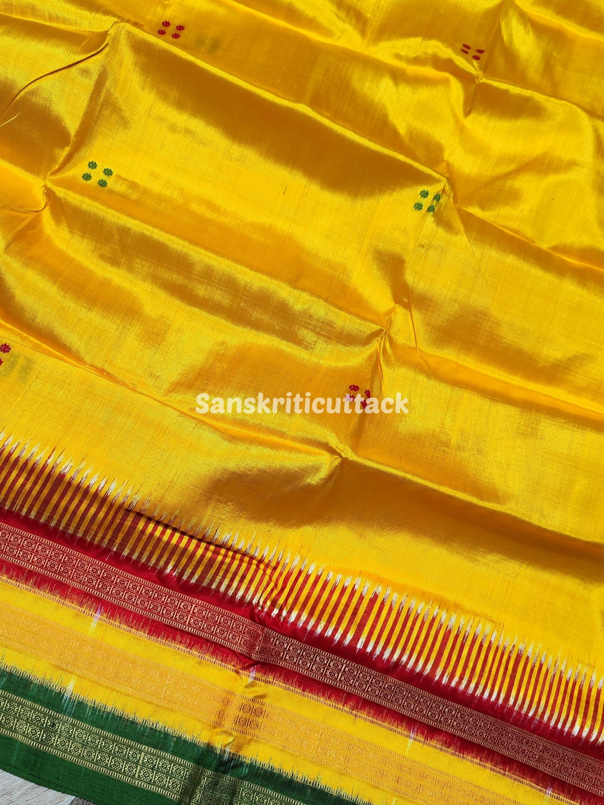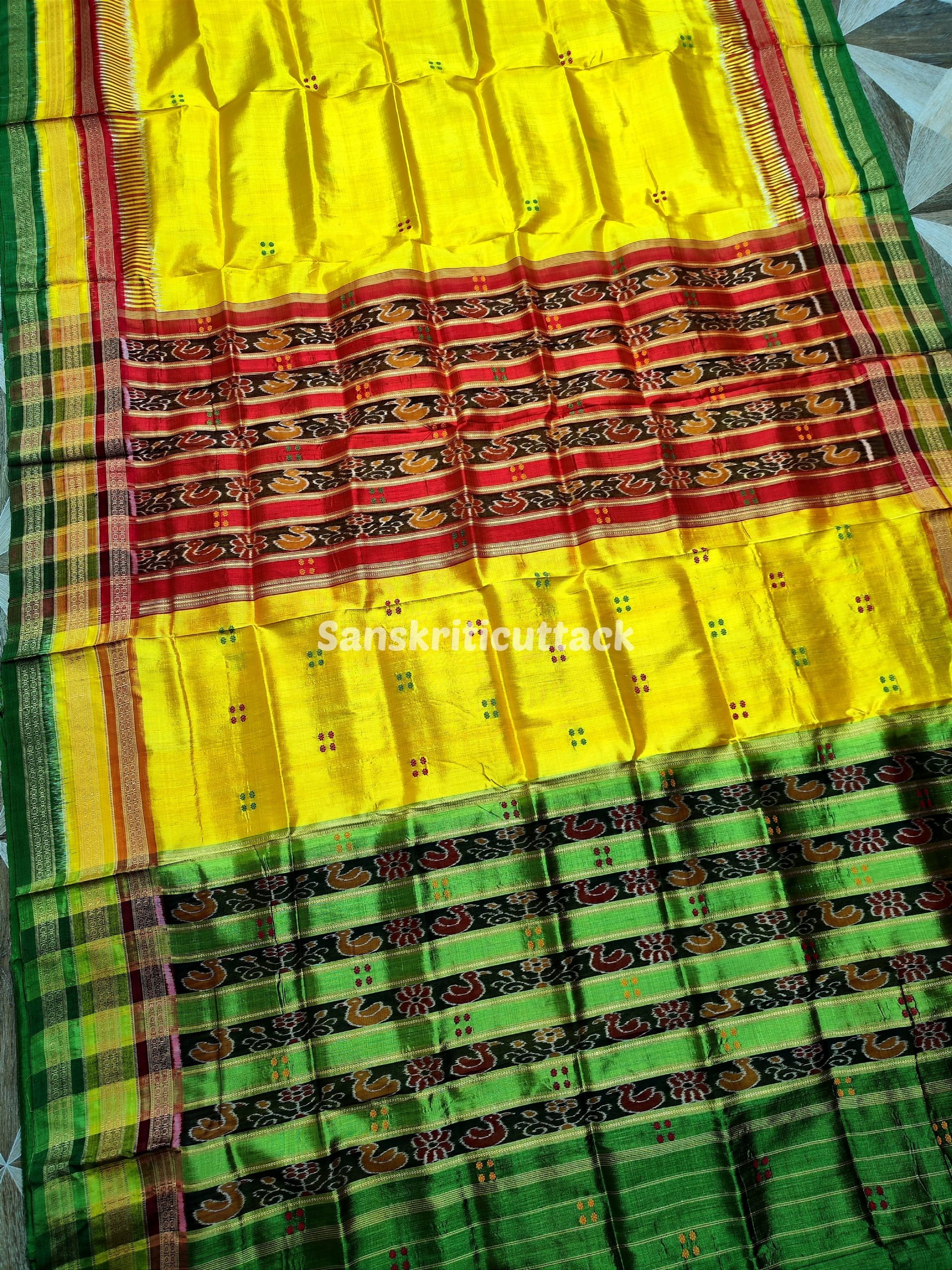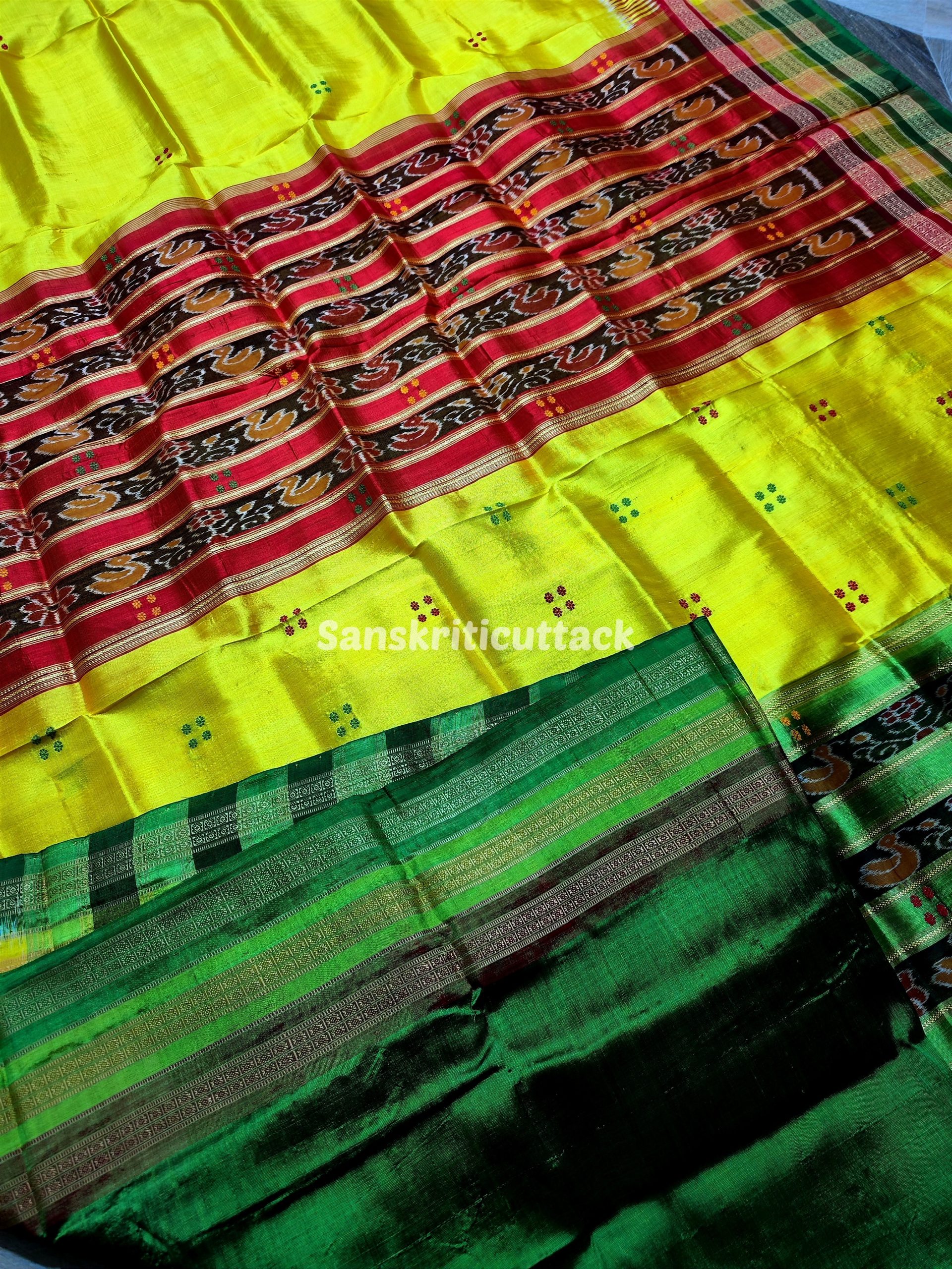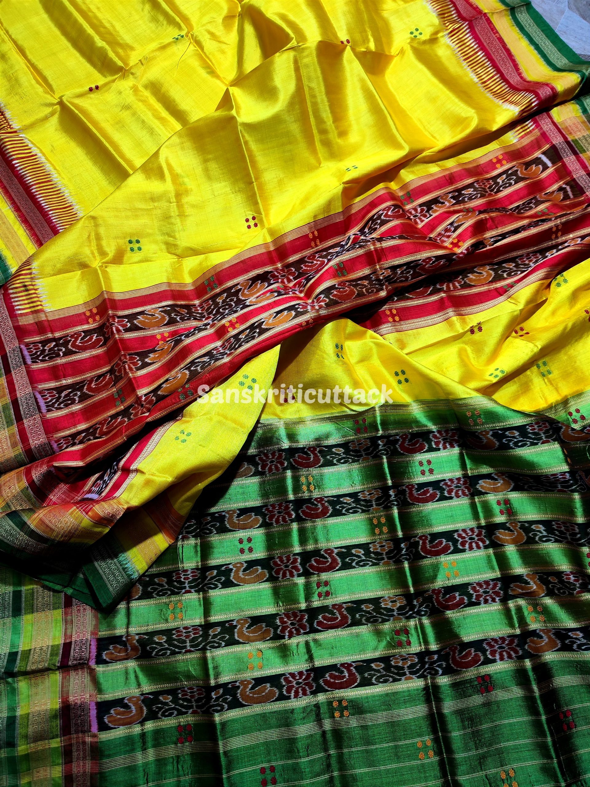 Elevate your ethnic wardrobe with our exquisite Yellow Red Green Handloom Sambalpuri Ikat Kathiphera Silk Saree. Crafted from premium handloom Sambalpuri Ikat Kathiphera Silk, this saree boasts a captivating blend of vibrant yellow, red, and green hues in its pallu and border. The intricate ducks and floral motifs on the pallu exude an aura of elegance, making it an ideal choice for formal gatherings.