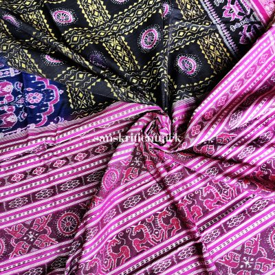 Sambalpuri sarees are renowned for their traditional motifs, including shankha (shell), chakra (wheel), phula (flower), all symbolizing native Odia culture. Additionally, the traditional craftsmanship of the ‘Bandhakala’ or the Tie-dye art, known as Sambalpuri “Ikkat,” sets these sarees apart. The intricate process involves tie-dyeing the threads before weaving them into a fabric, a labor-intensive technique that can take several weeks to complete.