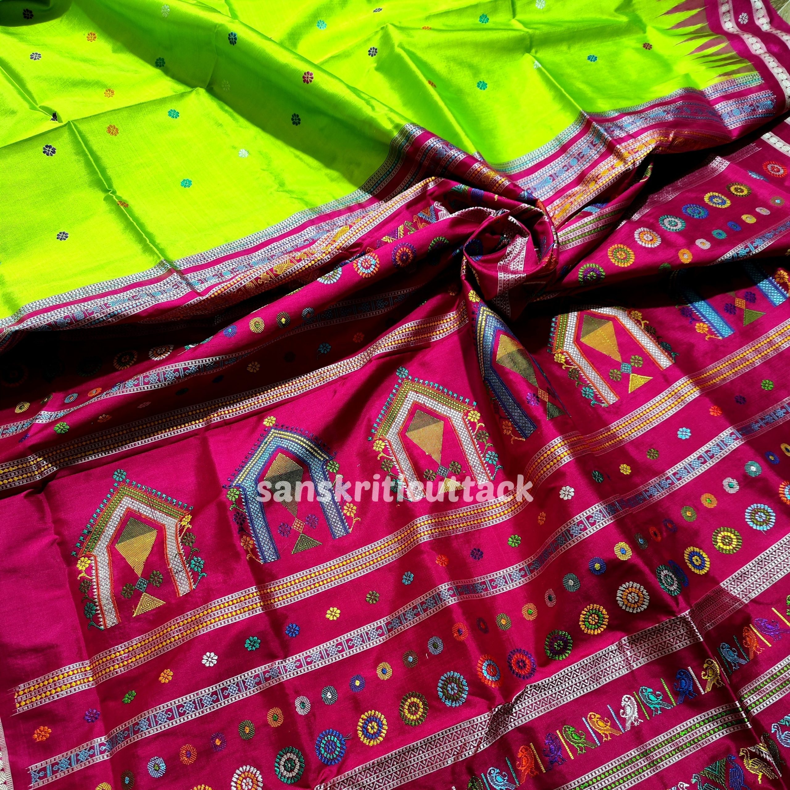 One of the key elements that set Dolabedi Sarees apart is the use of the extra weft technique, a common practice in Naupatna and Gopalpur weaving. This technique allows weavers to incorporate intricate designs and motifs into the fabric, creating a mesmerizing play of patterns. The multicolored butas adorning the saree’s body add to its allure, juxtaposed against a relatively plain yet elegant backdrop.