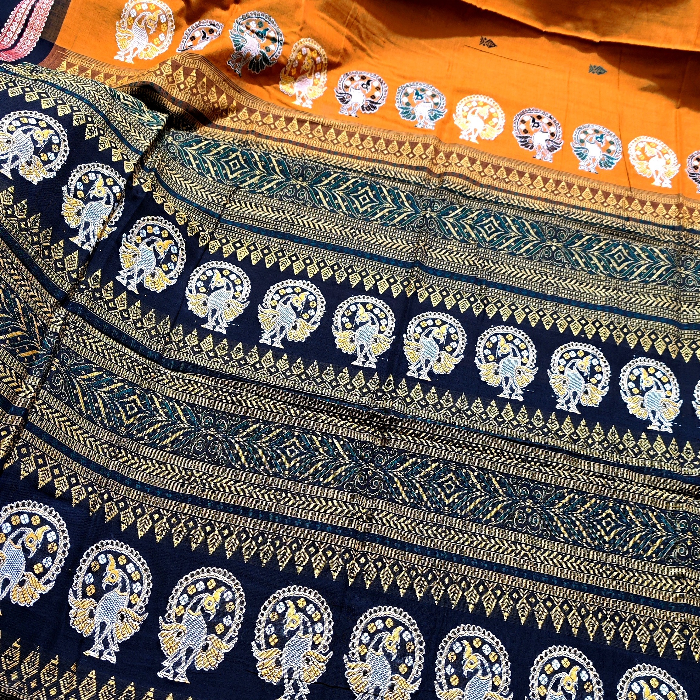 Craftsmen utilize fly shuttle pit looms and frame looms to weave Bomkai sarees. The unique three-shuttle technique employed creates a distinct solid border effect known locally as the “Muhojorha saree.” This intricate weaving method showcases the artisans’ precision and attention to detail, setting Bomkai sarees apart from others.