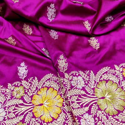 Meenakari work on Banarasi saree is an ancient art form that involves adding colored resham threads during the hand-weaving process to create intricate patterns and vibrant colors on the fabric.