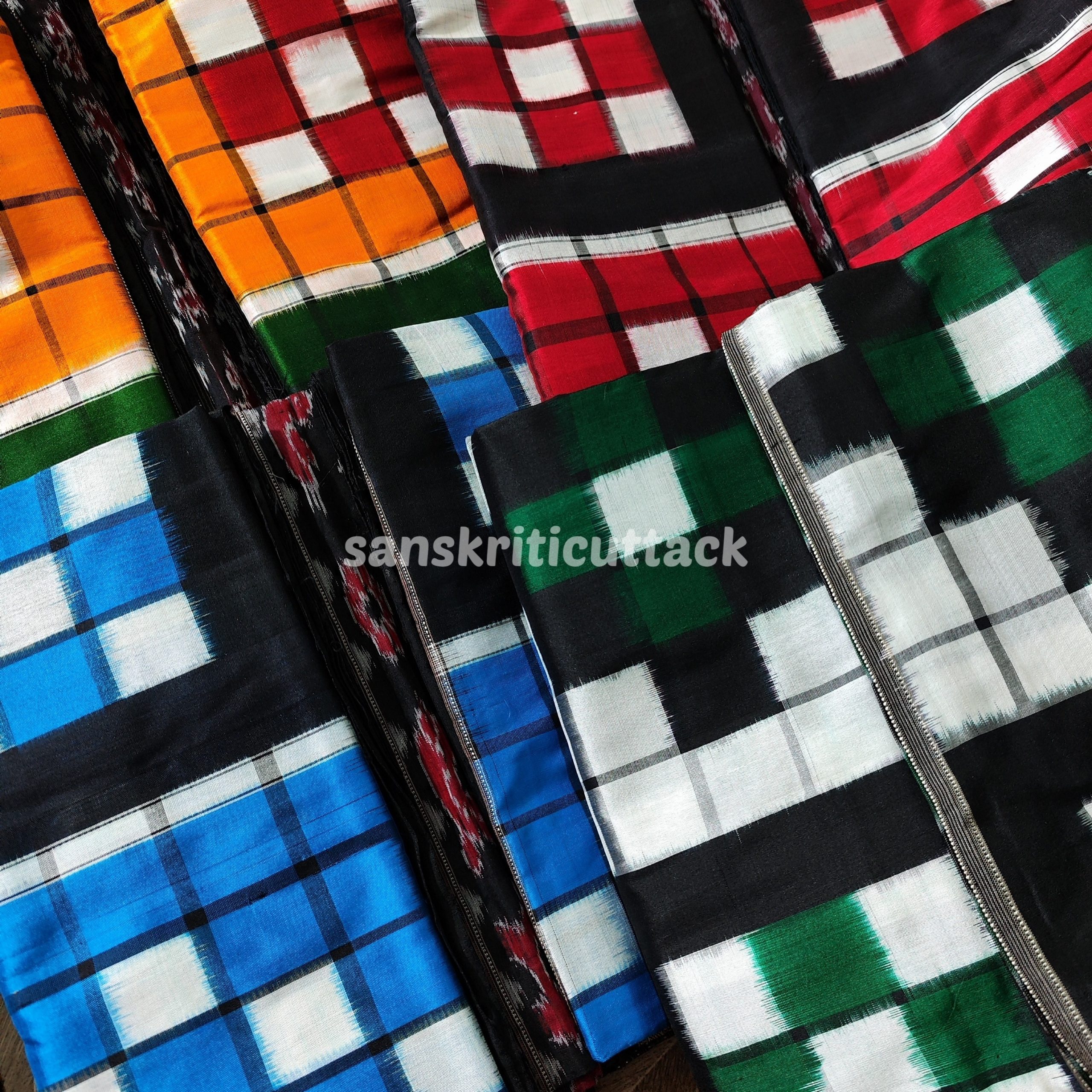 The saree often feature additional warp patterning on the main body and extra weft patterning on the pallu, with rows of chequered patterns woven in contrasting colors. The check designs on the main body contain white, red, and black squares that appear more vivid due to the double ikat technique. The colors of the saree are predetermined, and the dyed threads are then woven together to produce the final textile.